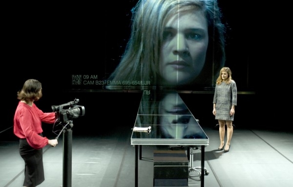 Mélanie Leray a su parfaitement rendre l’univers « étrangement inquiétant » de Mike Barlett. En effet, le monde High Tech qu’elle recrée sur scène nous est familier. D’une froideur métallique glaçante, le décor est marqué par l’omniprésence des écrans de contrôle et rend compte de la déshumanisation ambiante. Quant à la mise en scène, stricte à l’excès, où tous les déplacements sont écrits à l’avance dans cet espace fermé, elle est aussi impitoyable que le monde qu’elle décrit. Les deux actrices (excellentes) sont elles aussi à l’unisson de cet univers : des purs produits d’entreprise, l’un dominant, l’autre dominé.