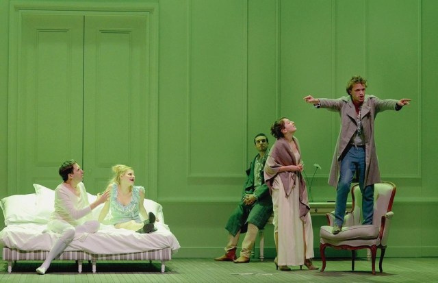 Avec Léonce et Léna, Lagarde libère la pulsion qu’il a retenue jusque-là. Choisissant un point de vue contemporain sur la pièce, il en propose une interprétation rock’n’roll totalement débridée qui réjouit, en grande partie par le contraste qu’elle offre avec ce qui précède et parce qu’elle avait été pressentie auparavant, de façon totalement indescriptible. Léonce est présenté comme un jeune rebelle, la guitare électrique sur la hanche, et son père, le roi Pierre, comme un homme politique dépassé et totalement névrosé. Ce dernier est incarné par le même comédien qui a joué Woyzeck et Danton, Laurent Poitrenaux. On retrouve également la comédienne qui a interprété Marie, la femme de Wozzeck, dans une nouvelle robe rouge. Une filiation se dessine : on se prend à imaginer que la situation est celle qu’aurait pu finir par obtenir Woyzeck s’il n’avait pas assassiné Marie. Le retour de la poupée-bébé en arrière-plan invite de façon discrète mais appuyée à envisager ce potentiel. Dès lors, Léonce apparaît comme leurs enfant, une vingtaine d’années plus tard. La filiation remonte encore plus haut, jusqu’à Danton, lorsque Léonce prône après lui l’épicurisme et l’oisiveté. Tout se noue ainsi et révèle une cohérence plus forte que ce que l’on aurait pu concevoir.