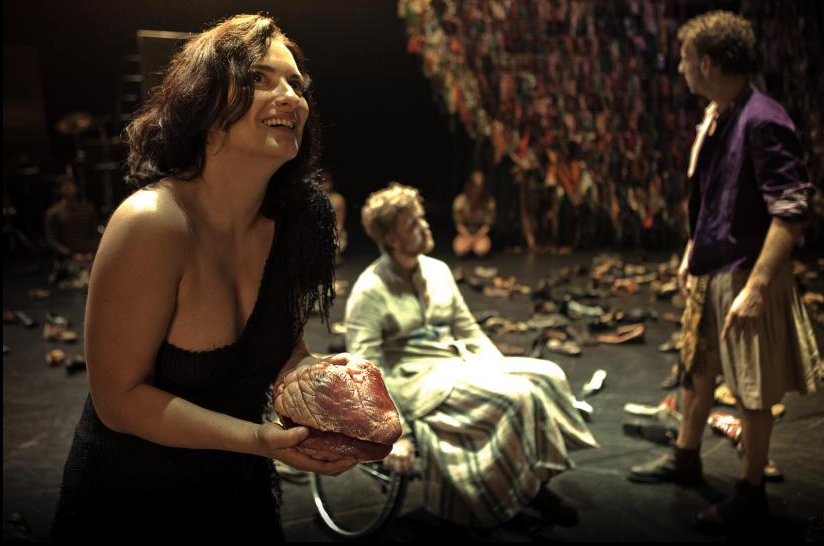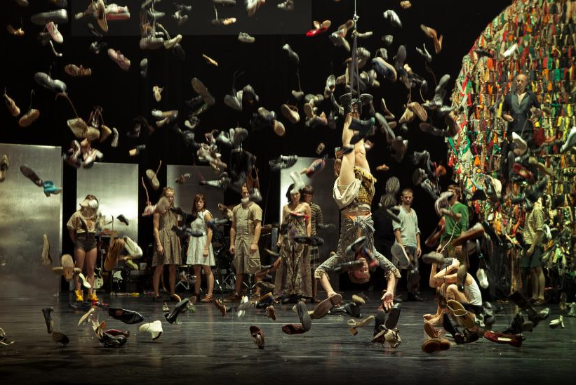 Une imposante installation plastique surplombe le plateau. Elle recèle dans sa tessiture dense et pourtant perméable les nœuds de significations du mythe. La fulgurance d’un torrent de chaussures déversé des hauteurs des cintres va nourrir l’obstination clinique d’une Jocaste perdue à elle-même, absorbée par un long, pénible et minutieux rangement. Ces images fortes s’inscrivent en surimpression dans la texture d’une photo de famille à trois reprises réitérée, dont nous savons par avance qu’elle doit se révéler dans des sels particulièrement corrosifs.