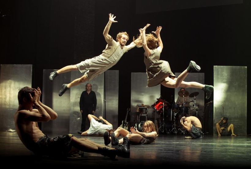 Le chorégraphe flamand reconnu pour son impétuosité s’attaque pour sa nouvelle création à un des mythes fondateurs de la civilisation occidentale. Il s’inscrit dans une lignée marquée par les œuvres de Gide, Cocteau et Pasolini, et qui passe également par les thèses de la psychanalyse freudienne. Le sujet taraude Vandekeybus depuis un certain temps. En 2006, il tente une première approche avec des enfants, Bêt noir, et signe pour le Ballet de Goëteborg en 2009 une autre version, Black Biist. Autant dire que la pièce accueillie par le Théâtre de la Ville est l’aboutissement d’un long chemin. La présence des musiciens sur scène introduit un souffle viscéral, dévastateur par moments, qui irrigue en profondeur cette création et la porte littéralement vers des paliers soutenus de paroxysme. La configuration est des plus simples. Une guitare amplifiée, qui lance des rengaines obsédantes, déchaine la furie et fait grincer des douloureuses déchirures dans le magma d’émotions ; des percussions réveillent des rythmes parfois archaïques, parfois bruitistes, auxquels se joint le bluesman Roland Van Campenhout, quand il n’est pas en train de donner corps au vieux roi pervers ou au troubadour subversif et menaçant. Vandekeybus s’octroie le rôle titre du tyran, mais il excelle surtout dans l’écriture des mouvements de groupe.