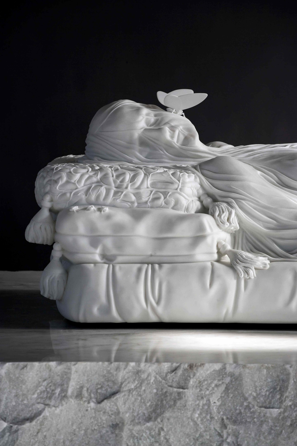 Visuels : Jan Fabre, Portrait, photo Stephen Mattues / Jan Fabre, Gisant (Hommage à E.C.Crosby), 2012 / Vues générales et détails / Marbre blanc de Carrara — 270 × 185 × 128 cm © Galerie Daniel Templon, Paris — Angelos — Photo : Pat Verbruggen / Jan Fabre, Brain Dragon, Marbre blanc de Carrara © Galerie Daniel Templon, Paris — Angelos — Photo : Pat Verbruggen / Jan Fabre, portrait, photo DR / Copyright Jan Fabre 2013 / Galerie Daniel Templon Paris.