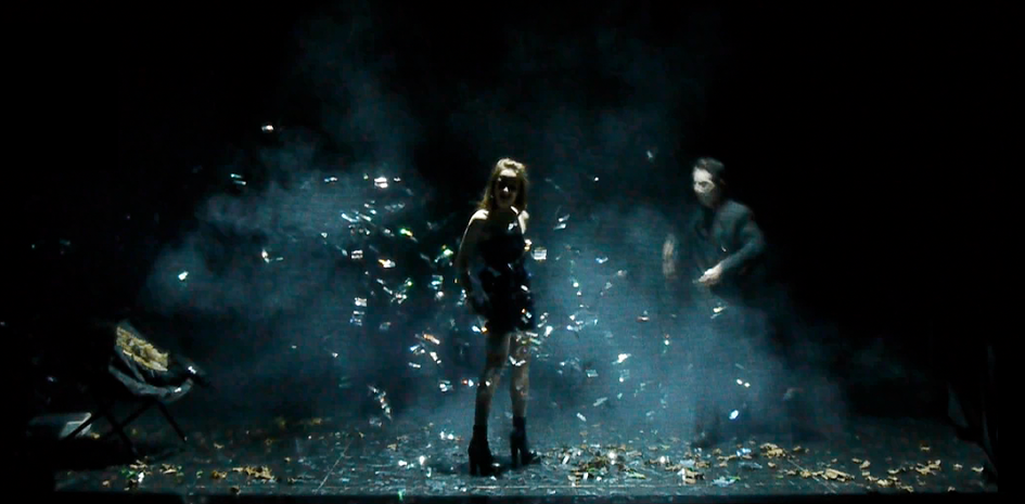 Seuls deux comédiens surgiront, dans 3 espaces-temps différents. D’abord, c’est cette jeune femme seule qui regarde Le Juste Prix et que nous entendons manger des chips. Le pouvoir hypnotisant et aliénant de la télévision est bien réel. Nous ne savons plus si nous regardons une comédienne, la télé, ou une comédienne dans la télé. Au gré de la lumière, qui s’éteint et se rallume sans cesse, elle se déplace de plus en plus près de l’objet d’attraction/répulsion. On pense à Requiem for a dream. Mais aussi aux Marchands de Pommerat. Ensuite, cette femme danse, seule face à son image, puis en boîte de nuit, lieu de perdition, où les flashes n’ont d’équivalent que les beats de la musique. Enfin, c’est dans la forêt que l’on se perd totalement. L’homme, mi-mime, mi-aveugle, fera quelques brèves apparitions.