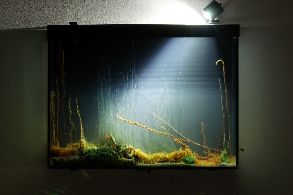 Véritable théâtre chimique, Présage est le fruit d’une performance dans laquelle l’artiste, associant dans un bécher différents produits chimiques, fait émerger un monde chimérique. Ces transformations de la matière, mises en mouvement par ses manipulations, qui sont simultanément filmées et projetées à l’écran, plongent le spectateur dans un monde aux couleurs et aux formes fascinantes. Ces expérimentations donnent naissance à des modèles réduits d’organismes vivants qui sont ensuite figés dans la résine, devenant ainsi de véritables natures mortes.