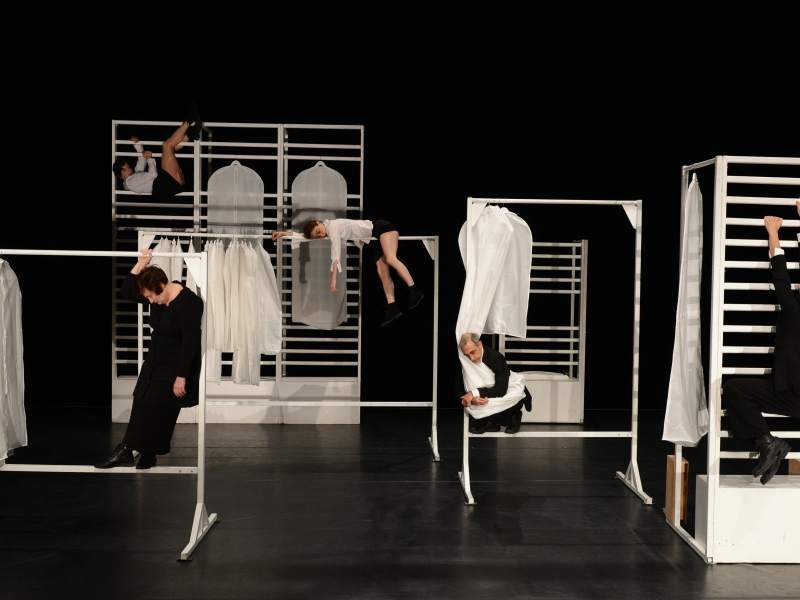 Chacun de ces chercheurs d’or modernes court – ou plutôt danse – après sa place, son costume, essaie de trouver des habits adéquats, qui restent malgré tout inexistants, dans ces housses vides et transparentes. Les dialogues comme les chorégraphies marquent une même tendance à la répétition, la dérision permanente, l’automatisme. Des formes ressemblant de près à de l’aliénation, en écho avec des corps et des pensées qui varient sur les mêmes mouvements : répéter, tourner, chercher.