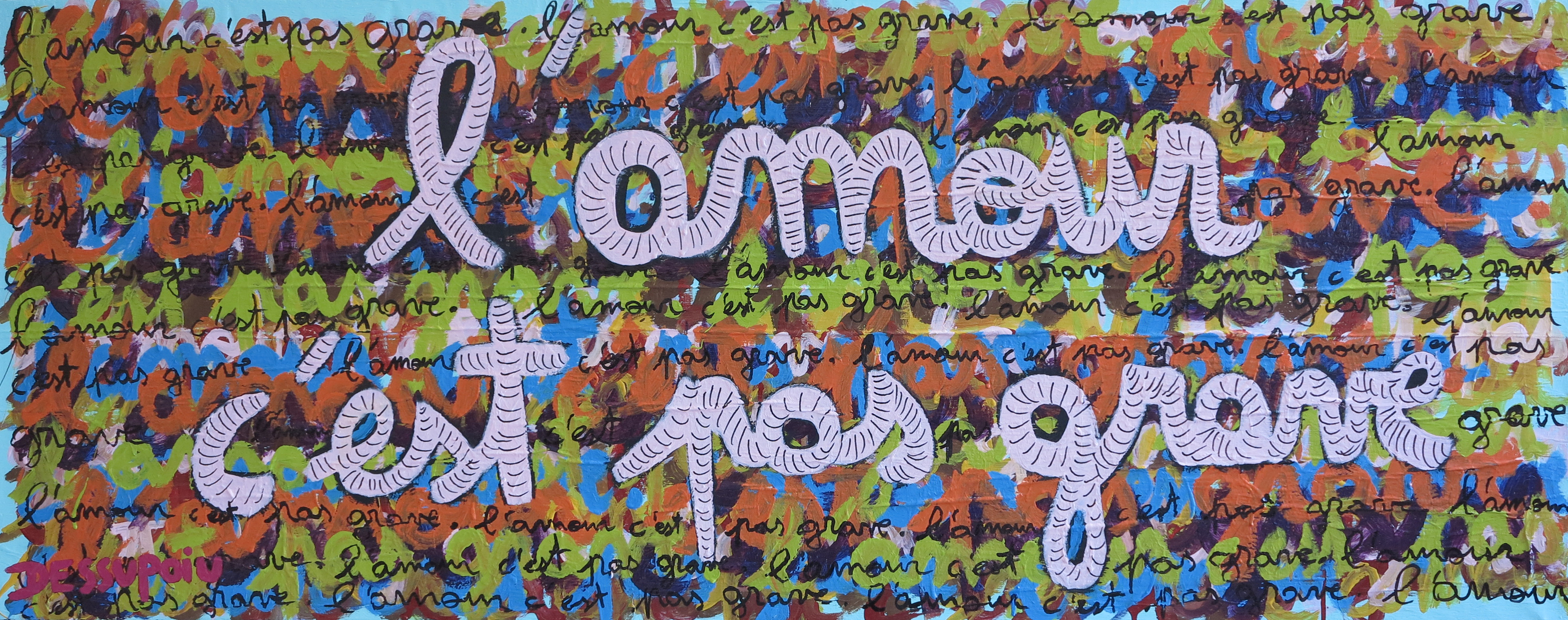 Son année 2013 s’ouvre sur plusieurs projets d’expositions et sur une nouvelle période d’expression. Ses toiles se couvrent ainsi de formules choc répétées à l’infini dans d’improbables glacis. Profondeur de champ ouverte au maximum du possible et du lisible pour marquer les esprits et les cœurs. Empreintes géopoétiques introductives d’une néo-volonté mélancolique d’usurper le littéraire au service d’un social beat et désespéré. Où va la société, il va. Où plonge la société, il plonge. Dessupoiu le sudiste n’en finit pas de radicaliser une esthétique née de l’écoute de Bob Dylan et de Lucio Dalla, de la lecture de Jack Kerouac et d’Allen Ginsberg.