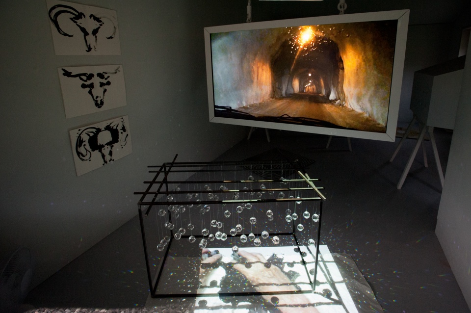 C’est la troisième exposition personnelle organisée chez Yvon Lambert à Paris après celles de 2005 et 2006 et à New York en 2010. A cette occasion, Joan Jonas présentera une série d’oeuvres (vidéos, sculpture, installations) issue de l’installation du même nom Reanimation (In a Meadow) qui a été montrée à la Documenta 13 de Cassel du 9 juin au 16 septembre 2012. Dans le parc de Karlsaue, l’artiste a imaginé un dispositif de cabane en bois dans laquelle on pouvait apercevoir de- puis les fenêtres des vidéos accompagnées de dessins et de sculptures formant, comme toujours dans son travail, un écho à la performance éponyme réalisée avec le pianiste de Jazz Jason Moran le 13 septembre 2013 au Kaskade Cinema de Cassel. Cette performance consistait à une improvi- sation musicale et gestuelle associée à la vidéo et à l’image autour d’Under the glacier, roman du Prix Nobel islandais Laxness Halldór, thème sur lequel l’artiste travaille depuis 2010.