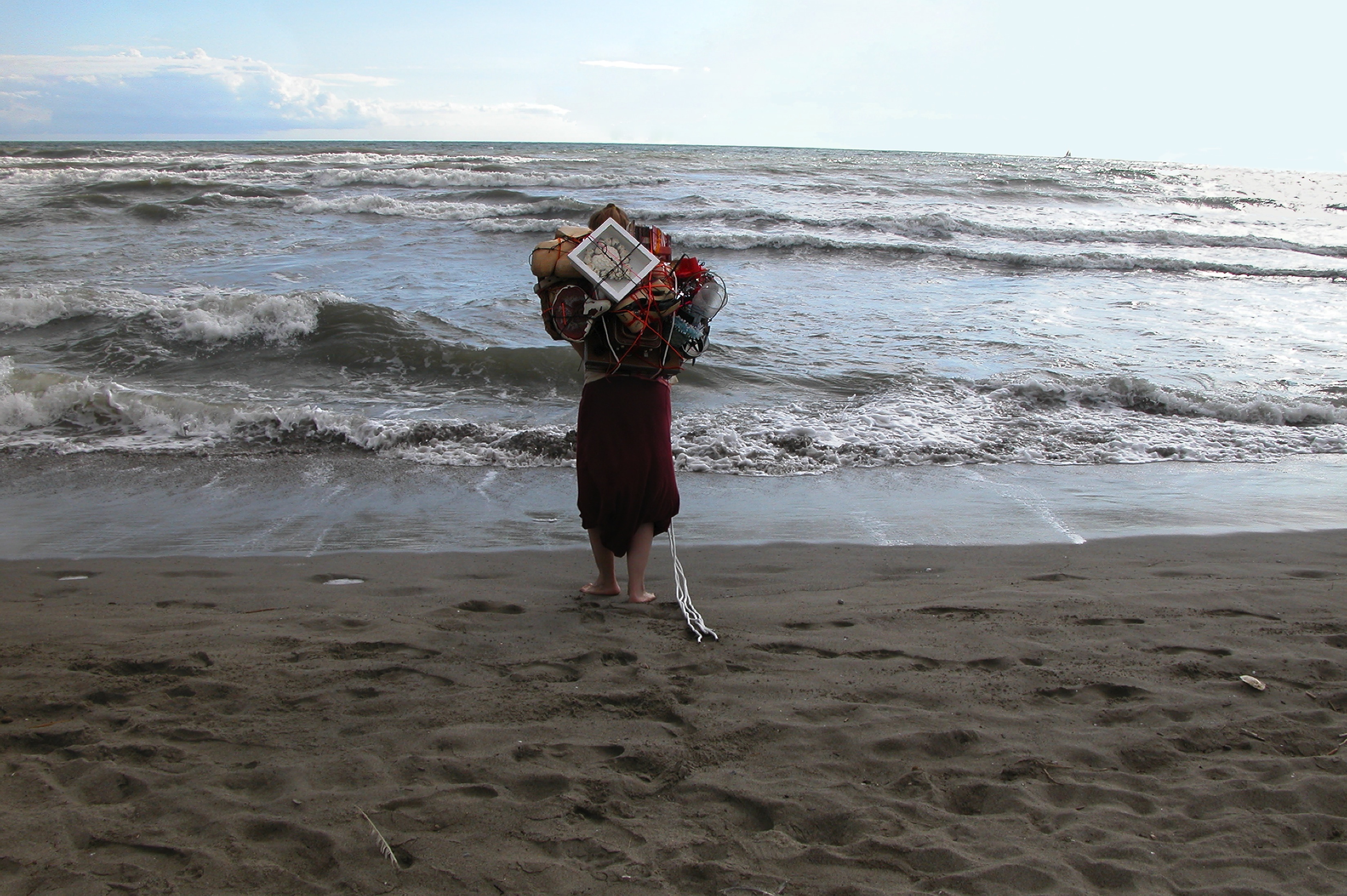 L’autre versant de sa pratique artistique consiste en des performances conduites sous des contraintes que l’artiste s’impose à elle-même. Aveuglée, surchargée, handicapée dans ses gestes et dans sa progression, l’artiste vit une perte de contrôle et une dépossession d’elle-même. La création se montre alors sous son aspect de tâtonnements et de ‘’démaîtrise’’, forçant l’artiste à tout de même créer alors qu’elle est en déséquilibre complet. C’est ainsi qu’elle compte procéder à Venise, de son point de départ sur le site des Giardini jusqu’à un point d’arrivée auquel elle parviendra à la fin de sa déambulation affligée, voyageant en partie au moyen d’une gondole. ‘’C’est la première fois, dit-elle, que je me livrerai à une performance aussi longue. Elle sera livrée en 3 phases, dont chacune fera bien une heure.’’ Dans un premier temps, l’artiste s’emballera jusqu’à l’inconfort, se transformant du coup en figure sculpturale qu’elle constituera à l’aveugle. Puis, ce sera la déambulation qui l’amènera, à tâtons, jusqu’à une gondole, aidée en cela, espère-t-elle, comme en la première phase, par des interventions d’un public cherchant à deviner son itinéraire. ‘’Là, précise-t-elle, je serai dans un état, voulu, recherché, de dérive et de désorientation.’’ Puis, enfin arrivée dans la gondole, elle parcourra la cité, sorte de sculpture mouvante, suivant un trajet qui la montrera en apparitions dans des lieux choisis pour mettre l’œuvre en valeur.