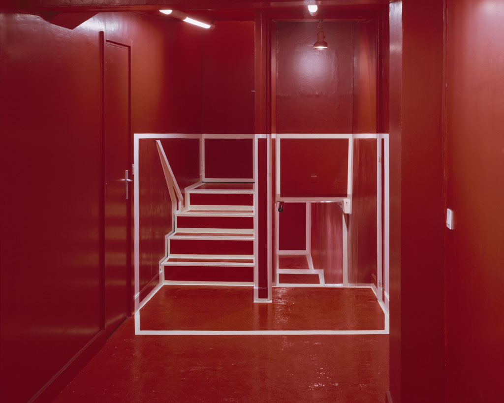 Proposer ce type d’exposition à Felice Varini, c’est donc lui proposer une architecture qui lui permette de « rejouer » des œuvres qui ont particulièrement compté dans son parcours, agencer la HAB Galerie en autant d’espaces que d’œuvres. Des premières de 1979 à celles qu’il a développées tout récemment, de ses fameuses anamorphoses peintes à son travail photographique ou au fusain, l’exposition prend la forme d’un parcours labyrinthique dans l’œuvre de l’artiste. Suite d’Eclats en est l’image : une appréhension autant physique que mentale des points de rencontre entre l’espace, la forme et la couleur. David Moinard, Commissaire de l’exposition