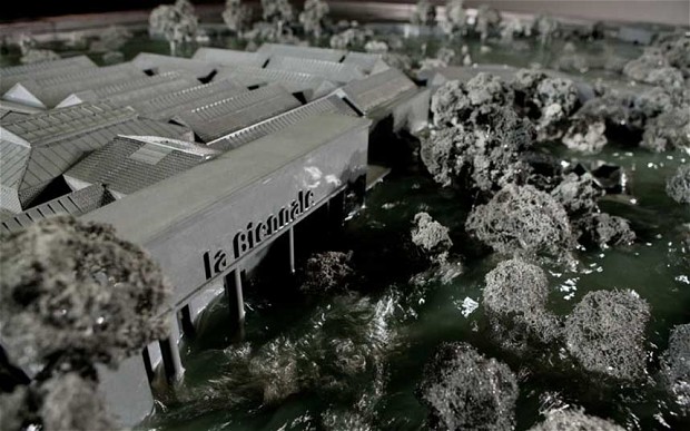 Tout juste à côté, le Chili propose une oeuvre tout simplement majestueuse d’Alfredo Jaar. Son « Venezia, Venezia » est une sculpture aquatique d’imposantes dimensions qui joue la surprise : en effet, la première vision en est ce bassin de métal accueillant une eau glauque et immobile, l’eau de la lagune, toujours bouchée, verdâtre et malsaine. On pourrait rester simplement en contemplation devant ce morceau de lagune si d’un coup -et silencieusement- un dispositif hydraulique ne faisait émerger dans les eaux du bassin une maquette à l’échelle des Giardini et de leurs pavillons ! Superbe métaphore que l’engloutissement et la résurgeance alternativement de ce haut-lieu de la Biennale, à l’image de cette ville tout entière vouée à l’anéantissement par les eaux et à la disparition, tout comme peut-être l’art et les grandes machines de l’art ?
