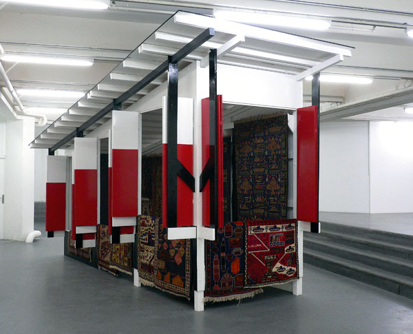 Visuel : Michel Aubry, Mise en musique du kiosque de Melnikov, 1925-2009. Bois peint, tapis afghans. Vue de l’installation au Centre d’art Le Parvis, Ibos, 2009. © Michel Aubry. Courtesy de l’artiste et Marion Meyer Contemporain.