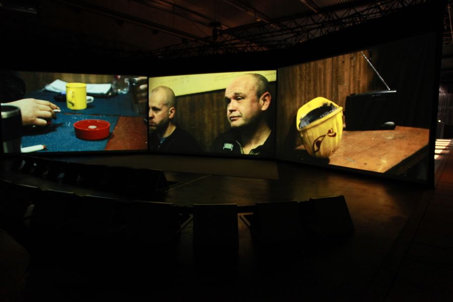 Cet équipement hors normes offre un immense espace modulable, qui évoque ici le gigantisme des ports marchands d’aujourd’hui. Au centre de cet espace a été aménagé ce qui symbolise le seamen’s club : un lieu cloisonné à la lumière chaude, chaleureuse. Sur certains écrans, on observe des portraits de marins de toutes nationalités, immobiles, en tenue de ville sur fond bleu. Sur d’autres sont interviewés des personnes qui travaillent dans ces clubs : celui de Hambourg, qui est une véritable institution, celui de New York, the protestant church for seamen, qui collecte et offre bonnets et écharpes aux marins pour Noël, ou encore celui de Dakar, qui n’existe plus physiquement mais où les marins sont tout de même accueillis. On assiste également à des scènes de vie du seamen’s club : ambiance masculine un peu relâchée, karaoké, et surtout, dialogues avec les familles via internet.