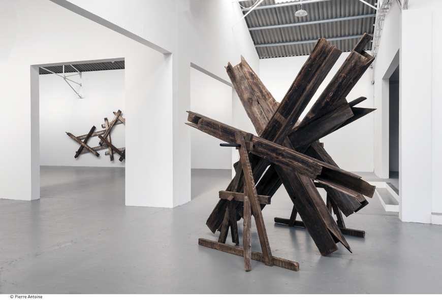 L’exposition est constituée d’un ensemble de sculptures produites à partir de bois de récupération âgé d’un bon centenaire et provenant d’une fabrique new-yorkaise désaffectée. Massives, les poutres et planches aux angles aigus, parfois brûlées et dotées de vieux clous rouillés, sont assemblées dans des constructions aussi imposantes qu’apparemment instables. Un regard attentif permet seulement de maintenir le mystère du système de fixation… Parfois simplement posés au sol ou ingénieusement fixées (on l’espère), l’artiste organise les sculptures en une évocation de notre système solaire, chacune représentant une planète, plus le soleil. Ici nulle lumière irradiante, lévitation ou rotation.