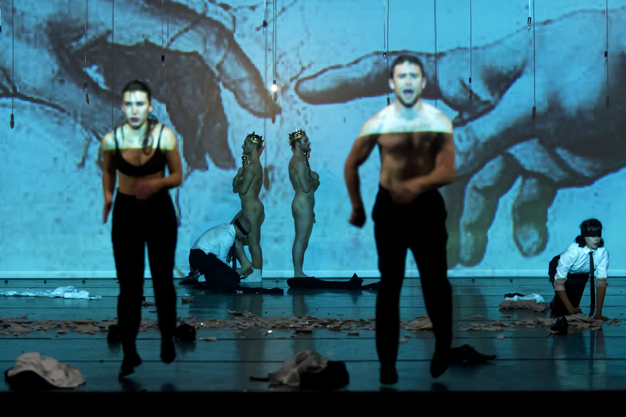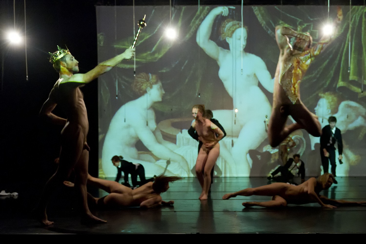 Notre sensibilité est happée par ce jeu d’entrées et de sorties. La prise de pouvoir sur scène s’effectue en échange d’un savoir inestimable. Cependant, on ne peut commettre l’écueil de concevoir le passage d’une théâtralité à une autre, par le biais unique de références en lien avec un héritage culturel déterminé. Si Jan Fabre met en scène le bousculement des configurations de la représention, il y parvient uniquement au travers de changements radicaux à l’endroit même de notre matrice langagière. La radicalité ainsi se déplace et se bonifie au fil du temps et de la représentation. Elle emploie tous les outils symboliques à disposition. Les mouvements chorégraphiques dialoguent avec des projections de peintures maniéristes ou encore néo-classiques, visibles en toile de fond. Dès lors une chose devient remarquable, qui réside dans la capacité qu’a « Le pouvoir des folies théâtrales » à faire émerger, avec un dialogue restructuré, de nouveaux modes de représentation, au sein même de l’histoire du théâtre. Certes, de nombreuses scènes dévoilent la force persuasive qu’a le pouvoir, lorsqu’il tente de limiter ce désir de réappropriation du langage, en lui imposant une discipline et un système totalisant, mais cela parvient à être déjoué dès l’instant où la folie entre en jeu, et fait de la scène son autel. Une folie qui explose, déroute à tout moment, mais qui dans ce mouvement général, se laisse guider par la conscience de son histoire.