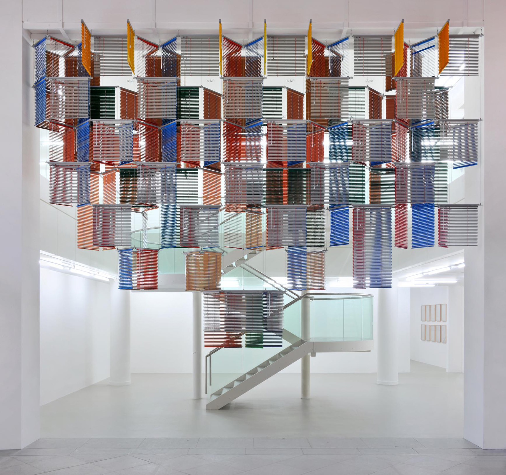 La première installation ouvre et ferme l’espace dans un même temps, il s’agit de Blind Curtain – Flesh behind Tricolore, ensemble de stores vénitiens répartis en carrés dessinant et masquant l’espace. Sorte de moucharabieh moderne, le store vénitien est l’un des matériaux qui revient régulièrement dans l’œuvre d’Haegue Yang. On ne voit pas ce qu’il y a derrière et vice-versa suivant l’endroit où on se trouve à l’intérieur de l’exposition.