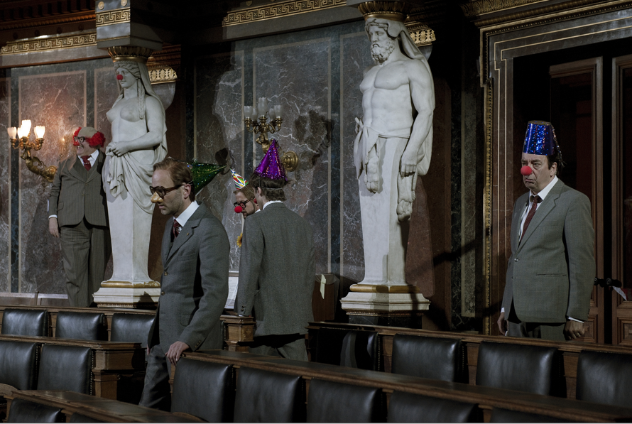 Une salle de Parlement de l’Autriche-Hongrie laissée à l’abandon depuis des années est sur le point d’être remise en état par des techniciennes de surface, en vue de cérémonies politiques diverses. Cinq femmes viennent donc nettoyer ce lieu lourd d’Histoire, dans lequel elles trouvent entre les rangées de fauteuils des déchets en tous genres mais aussi des hommes politiques, eux aussi vestiges d’un autre temps qu’il faut dépoussiérer et astiquer jusque dans les plus petits recoins. Après ce préambule qui fait entrer dans la mémoire, dans une temporalité dans laquelle se mêlent le passé et le présent, dix parlementaires, somnolents ou virulents, se disputent la parole ou écoutent avec assentiment le discours de l’un d’entre eux.
