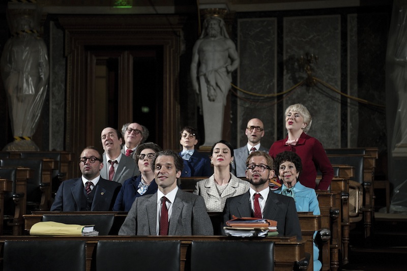 Dans cet immense terrain de jeu, en trois dimensions, le regard s’éparpille pour saisir le jeu de chaque comédien, constamment expressif, jusque dans le silence et dans l’écoute d’un orateur ou de la musique. C’est par cette expressivité de chacun et leur présence plurielle, capable d’interactions multiples, que Marthaler introduit le rire et l’humour pour traiter ce sombre sujet. Une chorégraphie précise est mise en place de siège en siège, créant des effets de dissémination ou de concentration chorale des comédiens. Il s’agit là plus que d’une métaphore, car les ils jouent, déclament mais aussi chantent, révélant des talents multiples.