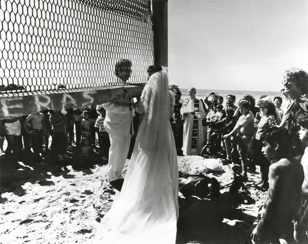 visuel : Emily Hicks & Guillermo Gómez-Peña : Border Wedding right where Border State Park meets with Playas de Tijuana with guests on both sides of the border, 1988