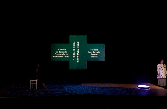 Ce dilemme indissoluble constituait un des ressorts de la littérature européenne du 19ème. Le retrouver à tel point acéré dans le travail d’un auteur contemporain est le symptôme d’un repli sur soi, donne la mesure d’un traumatisme sans précédent qui a secoué tout un pays, ravivant des vieilles peurs et des plaies encore béantes. Certes il y a des codes et des nuances qui nous échappent. Les traductions conjointes, en simultanée en Anglais et Français, ne savent rendre les subtilités et inflexions de la langue japonaise. L’irruption, à plusieurs reprises, de Satomi – personnage insolite dont le nom voudrait dire à tour de rôles beauté, intelligence, sagesse, ville natale, en fonction des caractères kanji utilisés –, ne saurait que trop nous le rappeler. Mais le malaise est bien là, communicatif, hautement inquiétant.