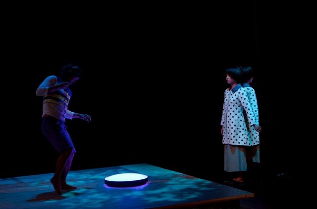 Il y a encore ce plancher en bois frais qui induit un toucher si particulier des pieds nus des interprètes. Le metteur en scène intitule sa pièce Ground and Floor et pose ainsi d’entrée de jeu la tension entre le sol immobile, immuable, lourd, dont le fantôme de la mère se fait le témoin, et le plancher mobile qui fait écran et facilite le départ : quitter son pays, voici ce que souhaite une future mère pour l’enfant qu’elle porte dans son ventre. Il y a enfin cette source de lumière changeante qui focalise l’attention et facilite le contact entre les deux mondes.