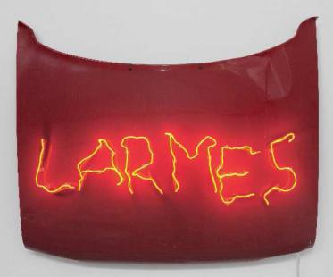 Visuels : Claude Lévêque : 1- Le réveil de la jeunesse empoisonnée / 2009 Néon blanc 205 x 40 cm / Collection Bernard Magrez / Courtesy the artist and Kamel Mennour, Paris / 2- Larmes / 2011 Capot de voiture rouge, néon rouge 108 x 134 cm / Collection Bernard Magrez / Courtesy Galerie Kamel Mennour, Paris / 3- Mon repos au Château, Claude Lévêque, 2013, traction, guirlandes lumineuses, lampes. / © Photographie Fabrice Seixas