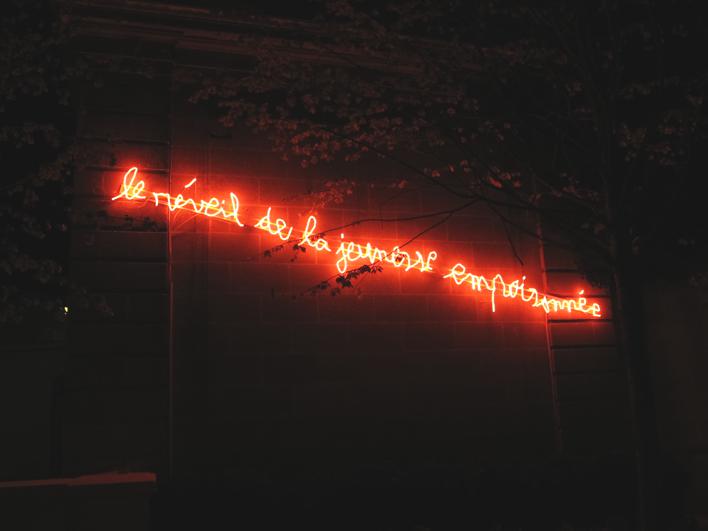 Surplombant, l’entrée de l’édifice, là où sur les monuments publics se détache la formule saturée de sentiments lénifiants « Liberté Egalité Fraternité », l’artiste a accroché une autre de ses écritures flamboyante « Nous irons jusqu’au bout ». Le message peut être interprété selon la sensibilité de chacun mais la place choisie, un fronton des Lumières, privilégie une lecture radicale, sans concession aucune.
