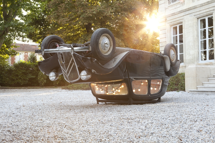Ensuite, devant le perron d’entrée du Château, on tombe sur cette mythique traction avant noire (renversée sur son toit) dont Roland Barthes disait dans ses « Mythologies » que seule la DS a pu la détrôner. Là encore, la signification première de l’objet, saturé d’un signifié qui lui colle à la peau (véhicule tant de la Gestapo que des FFI), est pervertie pour devenir, par « un renversement dans son contraire », une œuvre « désarmée », incapable de porter la guerre (sur le dos, sa capacité à se mouvoir est réduite à néant) et qui, avec ses guirlandes lumineuses ornant le plancher-plafond de son habitacle invite à danser, d’autant plus que les accents de « Billie Jean » (ligne de basse ostinato) de la star de la musique pop, Michael Jackson, sont diffusés en boucle.