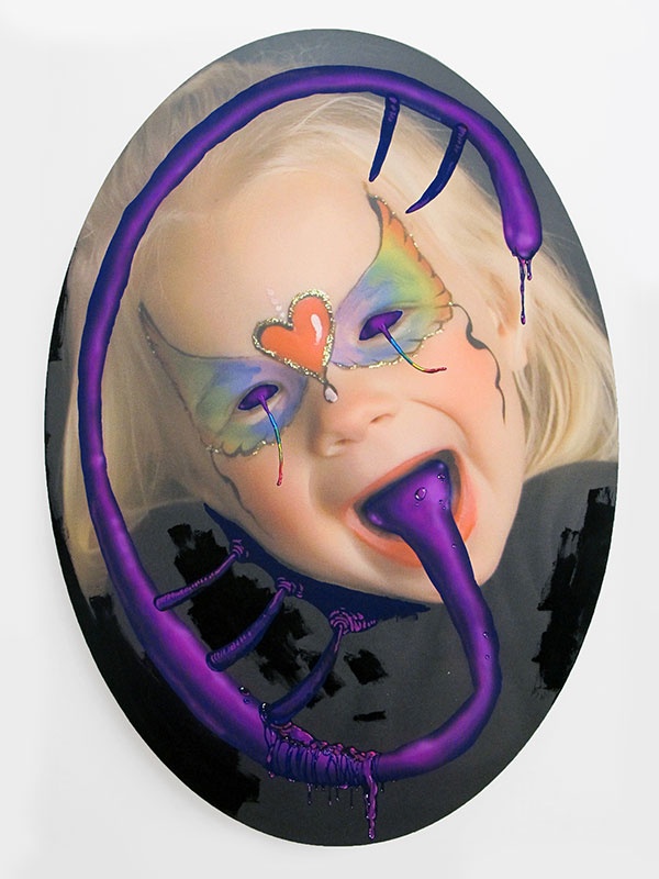 Le travail de Curry joue avec la logique du collage – le choc entre le grand art et le folklore, le poli et le rustre, Noguchi et Pappy Yokum. Dans “NEWDZ AND NEW GODZ”, les références à la culture populaire de masse sont plus restreintes, n’apparaissant principalement que dans une série de peintures de forme ovale imprimées d’images d’enfants extraites de manuels de peinture sur visage. L’artiste altère ensuite ces images afin que la pose vaguement dérangée de ces enfants déguisés déborde désormais d’excrétions violettes. Accrochées sur un parterre de peaux et de poils greffés entre eux, ces figures sont le ciment d’un corps nouveau, non défini à travers une vie intérieure et ses particularités psychologiques, mais par une profusion de différences et de similitudes – un principe de collage peut-être, pour la psyche.