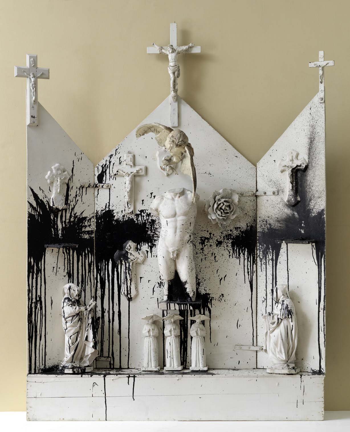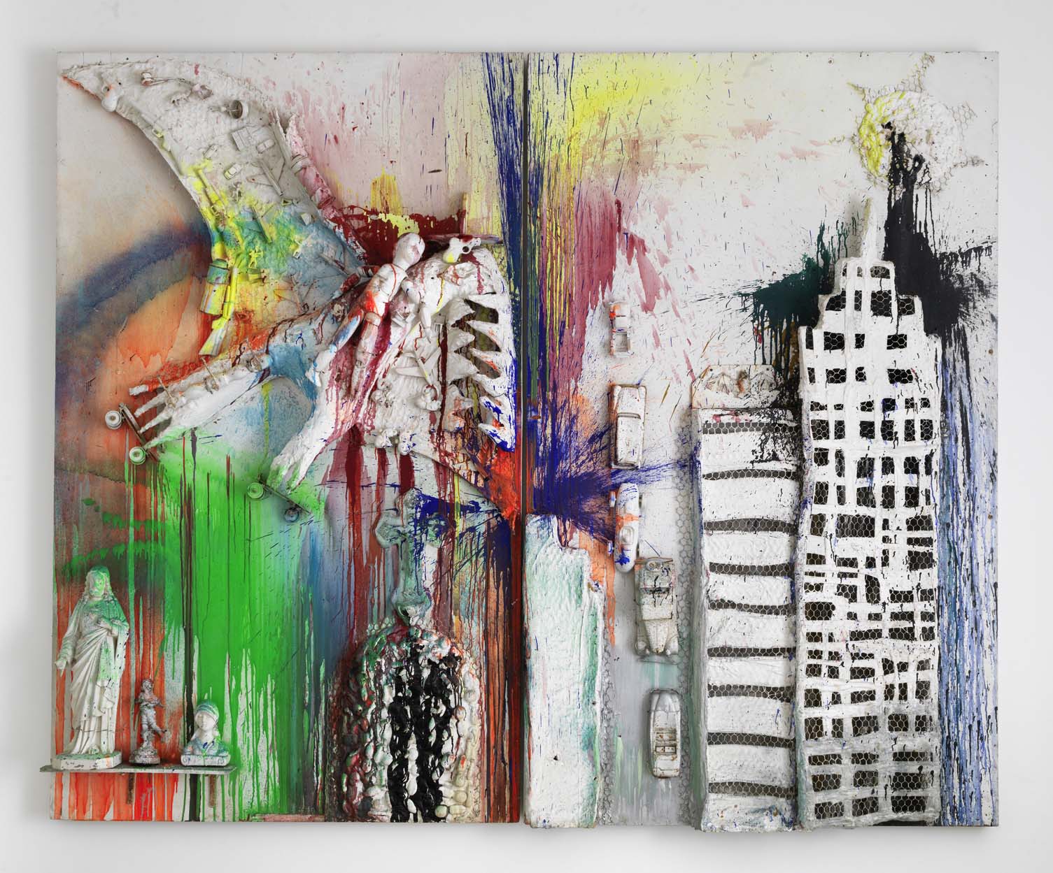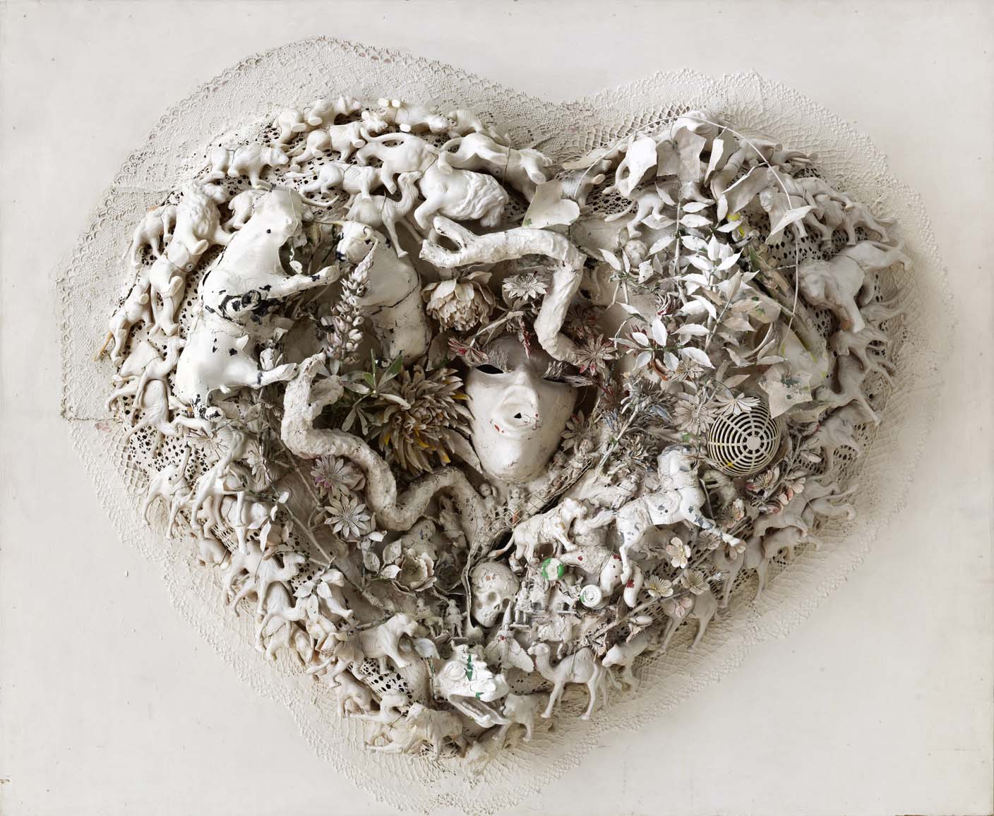 Chaque étape de cette carrière naissante est représentée dans notre exposition par des pièces majeures qui l’ont jalonnée depuis les « paysages-assemblages » miniatures de 1958, le Portrait de mon amour et le Grand Tir – Séance de la Galerie J de 1961, le fameux Pirodactyl over New York (dernier grand Tir assemblage réalisé en 1962), les « études » de 1963 pour le grand King Kong aujourd’hui au Moderna Museet de Stockholm, ou encore les Coeurs et les Cathédrales qui montrent le retour de la narration dans cette oeuvre singulière.