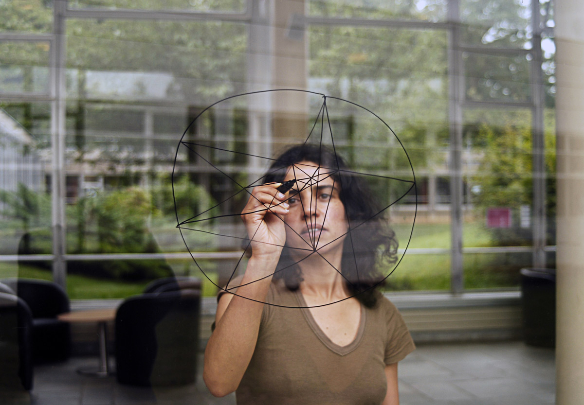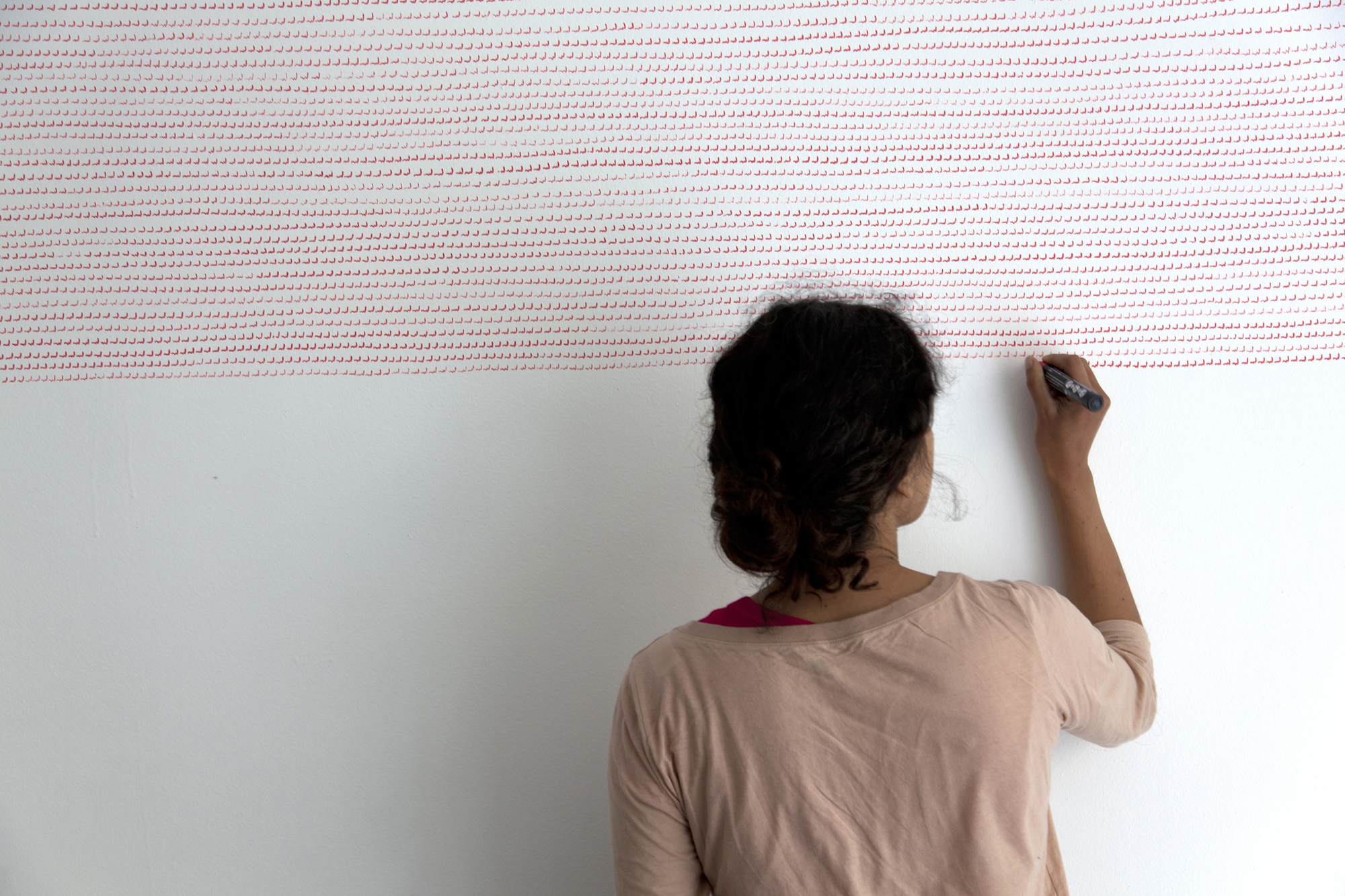 Myriam El Haïk est une artiste franco-marocaine, plasticienne, compositrice et performeuse. Son travail récent explore l’écriture répétitive : des signes simples faisant implicitement référence à des lettres arabes répétées de droite à gauche, de haut en bas. Gribouillage rapide, ainsi que notation minutieuse, ces motifs sont travaillés aux feutres de couleurs, tantôt sur papier, comme dans ses cahiers, mais aussi directement sur le mur. La création de ces motifs nourrit un autre axe de son travail, la performance, où l’acte de dessiner est au centre de la représentation. Et le dessin y figure comme trame, tissant des liens entre les différents médiums que l’artiste met en scène : musique, danse et vidéo.