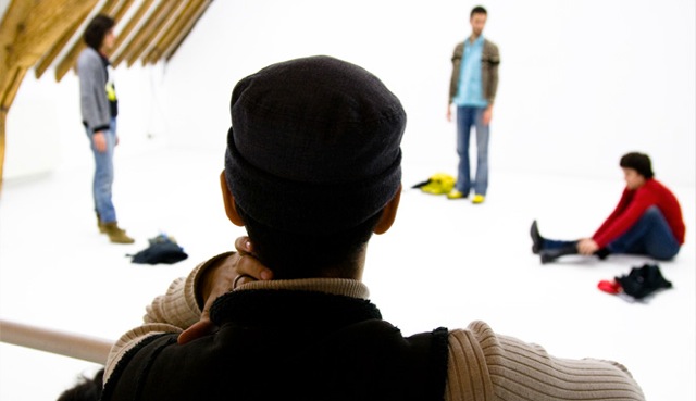 Le jeune curateur s’est déjà fait remarquer sur la scène artistique internationale par des expositions aux titres programmatiques. Ainsi Exhibitions’Ruins/Emotional Landscapes (Reykjavík, 2007), Une Exposition de mémoires (Nice, 2008), L’Exposition continue (Lausanne, 2008), Vides, Une rétrospective (Centre Pompidou, 2009), Une Exposition du sensible (La synagogue de Delme, 2010), Une exposition parlée (Jeu de Paume, 2013, après divers reenactments à Philadelphie ou Genève, à Prague ou Newcastle upon Tyne). Dans une critique revendiquée de l’objet et de son économie marchande, Mathieu Copeland imagine des expositions qui occupent le champ des formes re-matérialisées – voix, mot, vide, geste, mouvement. Ainsi l’éphémère, la mémoire et le temps deviennent les vecteurs cruciaux de ses projets. Le postulat de départ de la proposition accueillie par La Ferme du Buisson était d’une rare simplicité : Une Exposition Chorégraphiée est une exposition composée exclusivement de mouvements. Pendant un mois et demi, six heures par jour, trois danseurs interprètent les partitions écrites par huit artistes. L’ensemble de ces partitions est orchestré par le commissaire d’exposition qui crée le déroulé général, sorte de mouvement chorégraphique ou musical à plusieurs thèmes. Ainsi, d’un même trait, plusieurs questions sont posées avec une grande acuité : celle du spectateur qui est sans cesse conduit à renégocier sa position, celle des performeurs qui incarnent et transmettent les œuvres, celle d’une mémoire qui circule à travers des actes vivants. Une Exposition Chorégraphiée invite à une expérience inédite de l’espace et de la durée. Elle se forme et se déforme sous nos yeux. Elle ne se fixe jamais sinon dans la mémoire, écrit encore Mathieu Copeland.