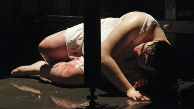 Autre proposition très forte, celle de Julie Teuf, assistée de Nanyadji Ka-Gara, qui dans « Claustria » de Régis Jauffret se met à nue pour tenter de dire l’inimaginable, celle de cette femme retenue prisonnière par son père, pendant vingt-quatre années de sa vie, dans une cave où elle a subi l’horreur de l’inceste et de l’enfermement. Ce « voyage au bout de le nuit » lui est venu à elle, cette comédienne qui excelle dans les rôles exubérants (ah on n’est pas prêt d’oublier la truculente belle-mère de Machine Feydeau !), en recherchant un lieu du théâtre qui pourrait lui suggérer son projet : « J’ai trouvé la cave. Les dessous de scène. Une grande pièce froide, humide, toute entière traversée de tiges de métal. Les murs et le sol tachés. De faibles ampoules enfermées dans des cages de plastique tout autour de la triste salle. J’ai aimé ce lieu tout de suite. Le plafond bas. Et le malaise. Lieu trouble. Histoire trouble. »