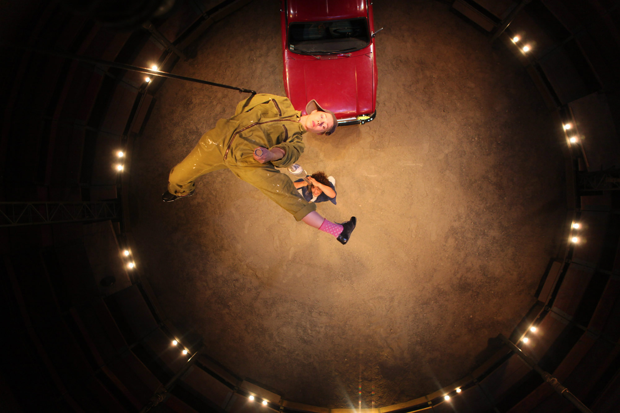 Une auguste vieille Simca 1000 rutilante et customisée à souhait (elle est riche de possibilités en tous genres – l’auto radio crachote des airs impromptus et n’en fait qu’à sa tête, les fauteuils un brin malicieux se renversent avec leurs passagers les invitant à des galipettes coquines, le capot s’ouvre tout seul – et elle semble même avoir acquis le don de se déplacer de son propre gré tant elle est « vivante ») surgit sur la piste, tous feux allumés et radio branchée. Ses occupants semblent eux aussi faire partie de notre monde même si tout les oppose, même s’ils contrastent radicalement l’un avec l’autre. Victor, le géant brun toulousain, et Kati, la fine finlandaise blonde, apparaissent – presque – naturellement devant nous pour nous raconter une histoire au travers des arabesques que leur corps dessine dans l’espace. Et cette histoire, mise en récit au travers d’une écriture corporelle d’une beauté à vous arracher les larmes (de joie), c’est la leur. Celle, si « extra-ordinaire » cela semble-t-il, d’un couple à la ville qui joue sur scène et « sans filet », sa propre existence, celle de la vie comme elle va, avec ses joies, ses tensions, ses creux, ses rebonds.