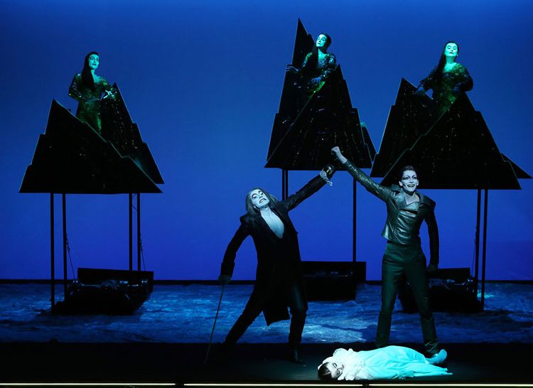 La scène du Théâtre de la Ville est prolongée par une fosse d’orchestre en contrebas pour ce spectacle, et les musiciens qui l’occupent, les Dark Angels, vont y jouer un rôle majeur. La place accordée à la musique des soeurs CocoRosie est telle que l’on hésite à parler de théâtre, que l’on invoquerait bien la comédie musicale si le genre n’était pas si dévalué dans le milieu. On appelle alors cela « théâtre musical », ce qui ne dit pas assez à quel point les artistes du Berliner Ensemble, qui chantent et qui dansent plus encore qu’ils ne jouent, sont polyvalents.