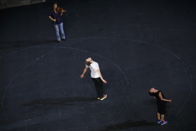 La violoniste se retire. Le silence qu’elle laisse bourdonne encore de la mémoire des accords qu’elle vient de jouer. Le plateau dévoile dans la lumière neutre, quasi – blafarde, le dessin d’une rosace qui n’est pas sans rappeler les pièces plus anciennes de la chorégraphe belge. Anne Teresa de Keersmaeker, accompagnée par Boris Charmatz, l’investissent. Ils cherchent toujours la tangente de ces cercles savamment entrelacés qui, sous l’apparence naïve d’un jeu de marelle, déplacent et diffractent la question du centre vers leurs points de croisement et interpénétration, rejouent l’air de rien le couple de forces centripète et centrifuge, brouillent la distinction dedans / dehors, facilitent la circulation du sens et la fluidité du mouvement entre les structures mathématiques qui composent la partition.