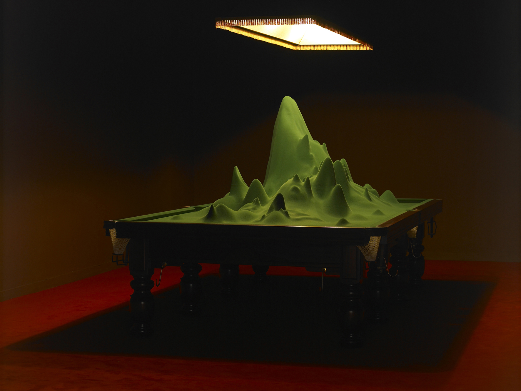 Stéphane Thidet, sans titre (Je veux dire qu’il pourrait très bien exister, théoriquement, au milieu de cette table […]), 2008. Billard, plafonnier, matériaux divers. 200 x 400 x 180 cm. Collection Frac Alsace. ©Stéphane Thidet / Courtesy galerie Aline Vidal (Paris). Photo : Marc Domage. Visible à Saint-Louis.