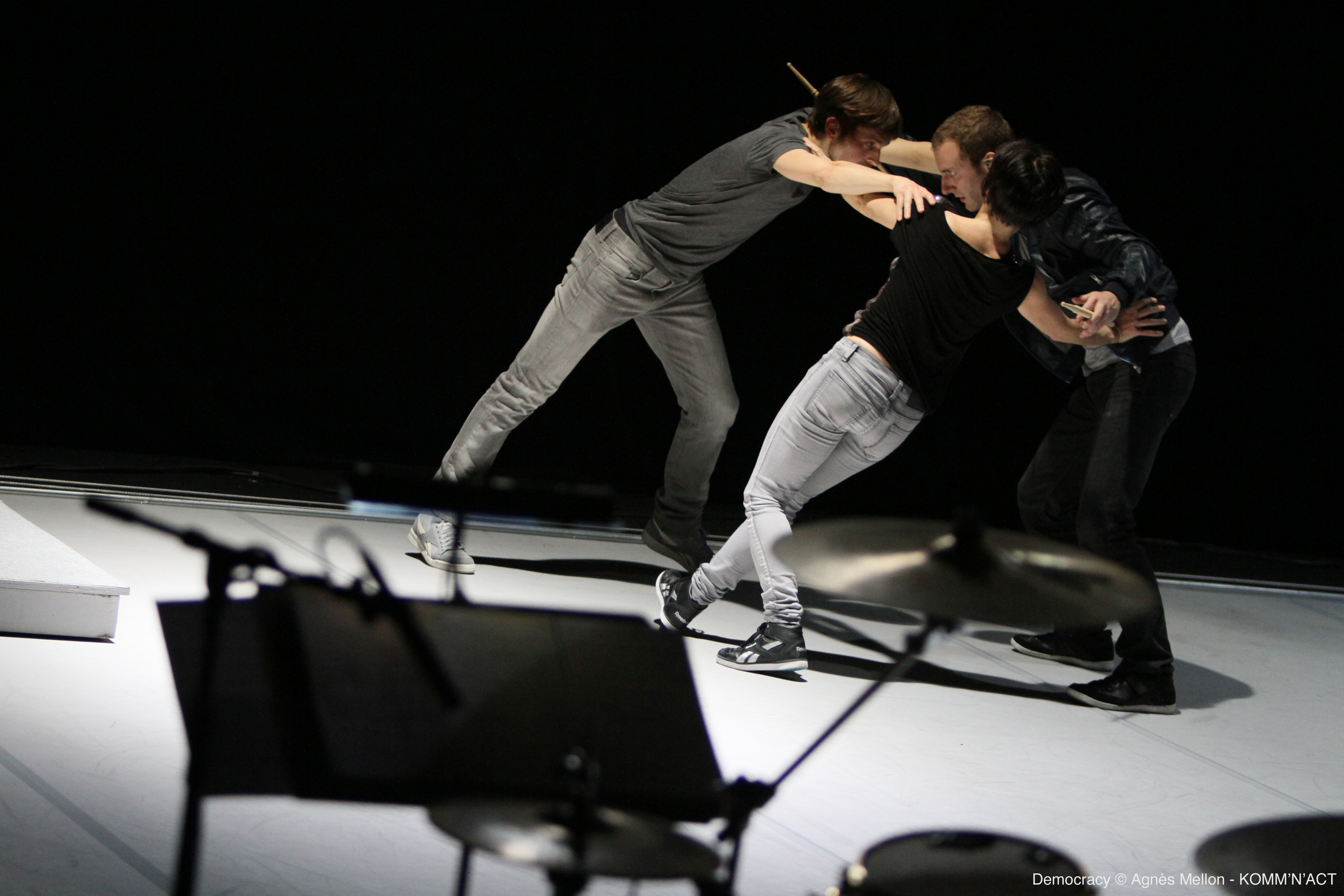 Autre point fort de ce festival : l’utilisation de procédés pantomimiques qui font avancer une narration ou nourrissent un propos politique. C’est ainsi que dans Démocratie, Maud Le Pladec, joue sur les interactions entre cinq danseurs et un quatuor de batteries. Elle cherche à créer une communauté d’individus où chacun gravite comme un électron libre, à la recherche d’une solidarité polémique. Cependant, si la performance musicale est assez convaincante, la danse se révèle assez pauvre tant elle se contente de traduire assez platement des mouvements musicaux nés, quant à eux, dans une réelle complicité.