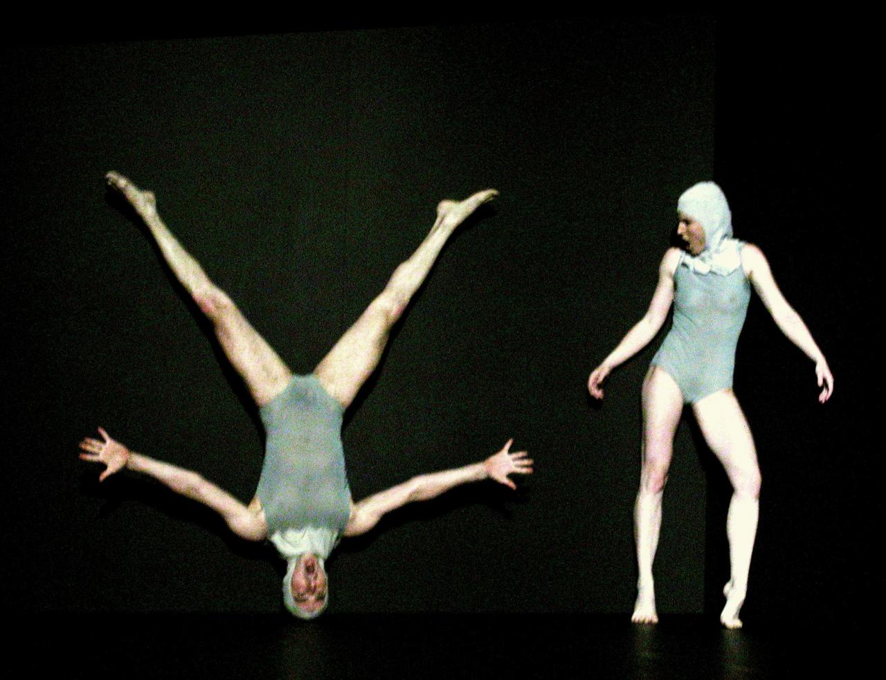 Les tableaux se succèdent, le bestiaire hybride, toujours teinté de burlesque laisse place à une certaine abstraction géométrique des corps. Tamar Shelef et David Wampach imbriquent leurs rythmes propres, travaillent une partition truffée de symboles hermétiques, déclinent des figures distordues du Tarot ou de l’alchimie, placées sous le signe de la gémellité. La transmutation semble opérer, le système sagittaire qui stabilise le monde entre l’horizontale et la verticale s’affole, la profondeur des angles exerce une redoutable force d’attraction. Toujours dans le registre du burlesque, les deux performeurs sont réduits désormais à de simples marionnettes, apparitions tronquées derrière une paroi qui posent ainsi les conditions de possibilité d’un glissement définitif dans l’imaginaire. Un précieux trésor jalousement gardé dans ce petit écrin vert acidulé, fruit défendu, toxique qu’on croque avidement, parachève la mutation. Cette dernière extase vire au péplum. David Wampach orchestre magistralement le détournement pop du classique sacrifice de l’élue, apothéose du Sacre du printemps. Excalibur, le monolithe de 2001, l’Odyssée de l’espace, Hulk, la Dame du lac – une drôle de ronde de références s’installe sur le plateau au rythme légèrement sautillant d’une danse traditionnelle bretonne. Les épiphénomènes de cette hybridation profondément délurée de l’imaginaire sont soutenus par un travail très sobre dans les gris, proche de la peinture flamande. La logique des associations va bon train, nous ne pouvons pas nous empêcher d’y déceler un clin d’œil à la littérature grise dont toute une frange est constituée par les scénarios de jeux de rôle.