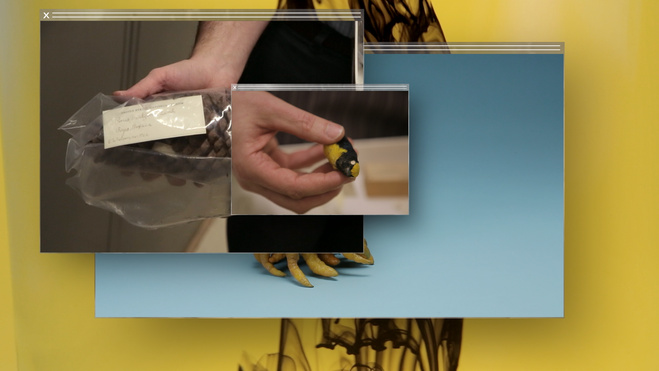 Métaphore d’Atlas supportant le monde, « Grosse Fatigue » tient le sien au creux de la main.Camille Henrot utilise le « spoken word » comme bande-son pour faire défiler ses micro-récits alllusifs et elliptiques, serrés dans des plans des collections du Smithsonian Institute de Washington, eux mêmes perturbés par un flot d’images piquées sur le net ou provenant d’autres sources documentaires, qui explosent à la surface de l’écran comme des pop-up incontrôlés.