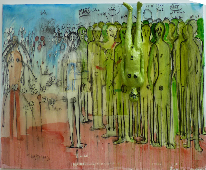 Pendant de l’univers concret, matériel, des enfants, ce monde en deux dimensions fonctionne comme un écran, sur le mode du virtuel et dans un rapport à l’imaginaire du spectateur qui peut déplier les images accumulées sur l’oeuvre : croquis d’estomac, esquisses du « Prototype de Paradis » montré à la Biennale de Lyon, images de primates… s’y associent librement. S’interrogeant sur l’échelle des oeuvres, l’artiste y a fortement imprimé la marque de son corps, n’y peignant pas plus haut que son bras levé. Aux accents autobiographiques, ce tableau de grand format est également inspiré par la collaboration de Fabrice Hyber avec les chercheurs de l’Institut Pasteur pour lequel l’artiste a réalisé en 2012 une fresque monumentale intitulée « Sans gêne ».