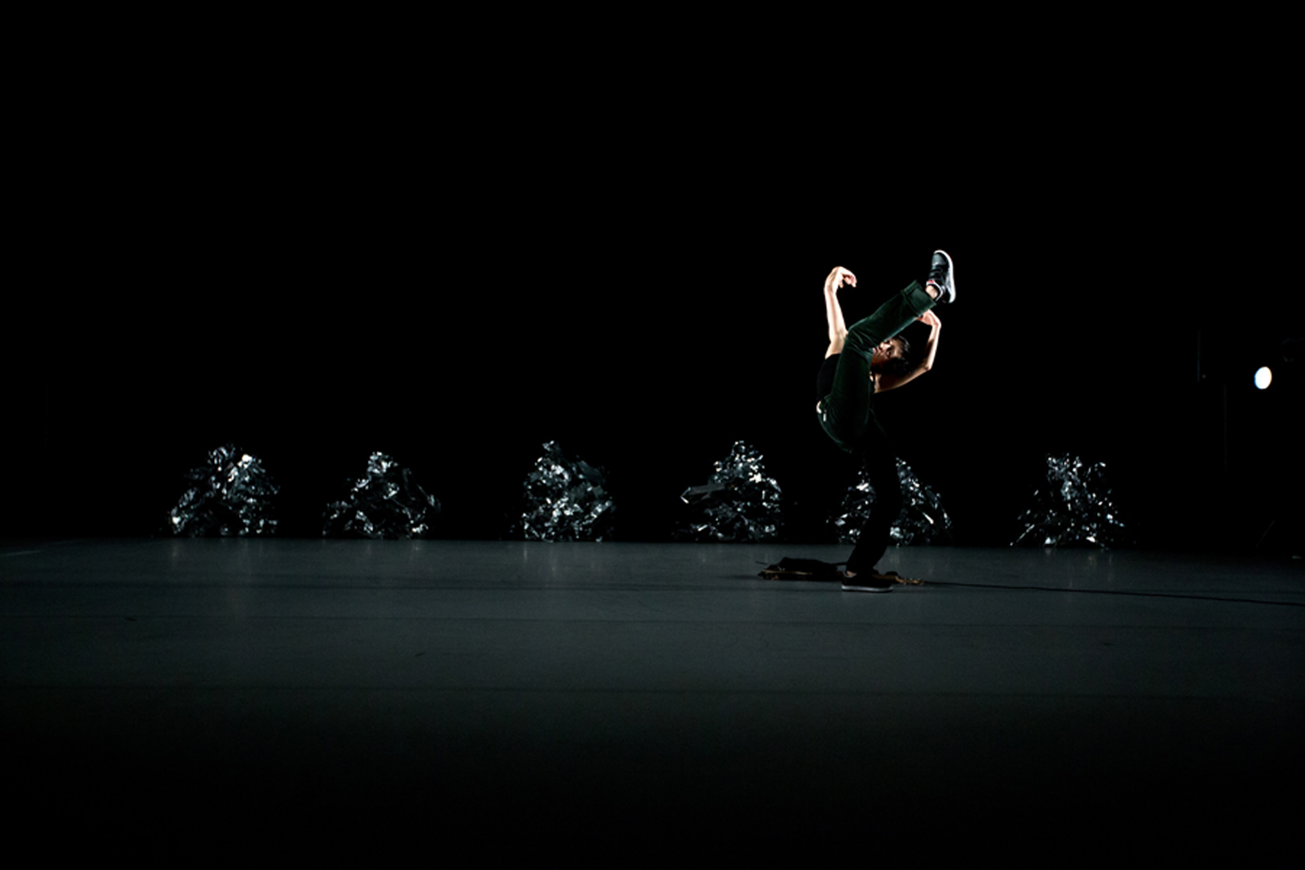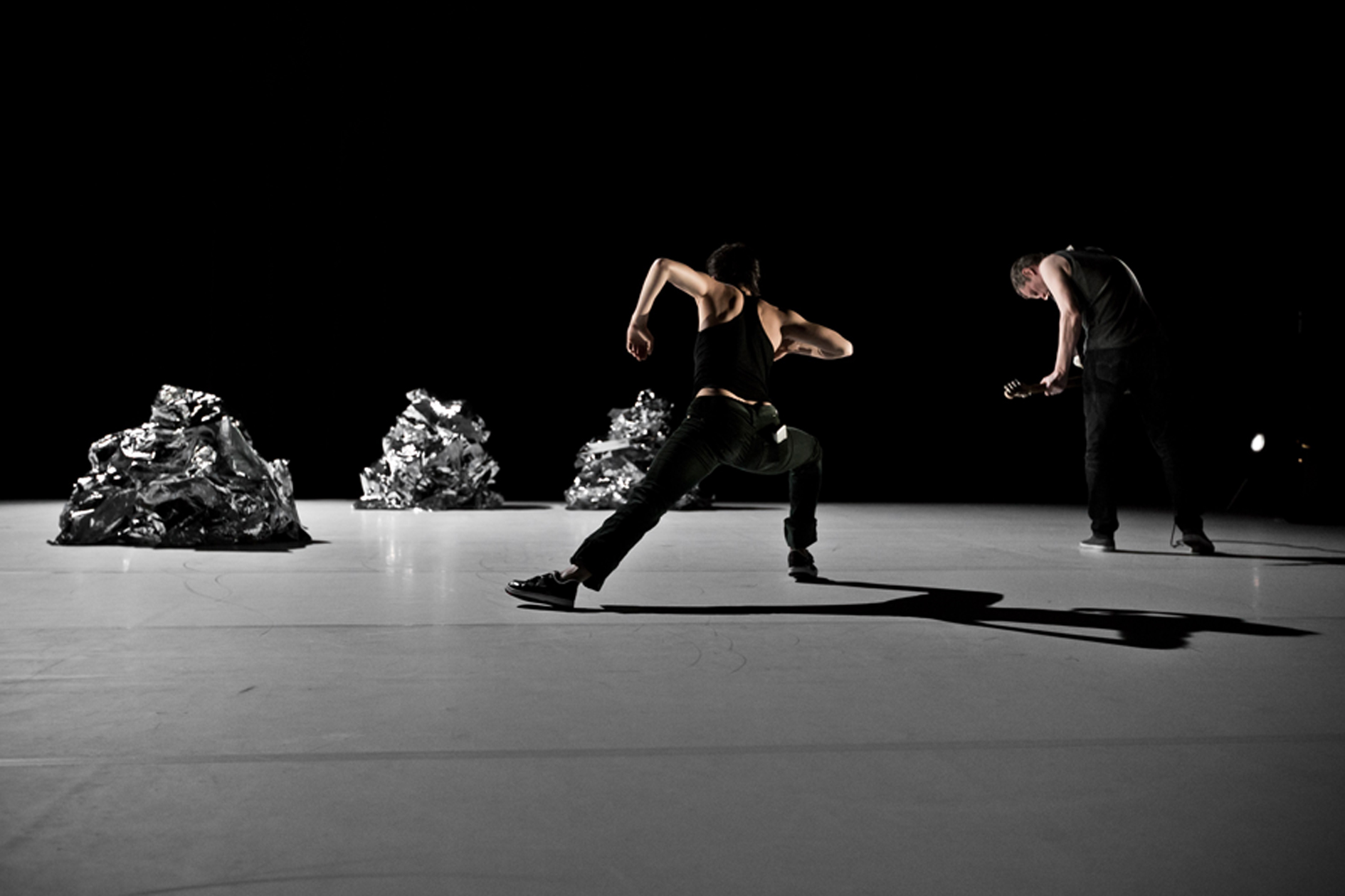 On nous laisse le temps de faire connaissance avec les cinq monstres immobiles, avant que les deux monstres mouvants, la danseuse Magali Milian et le guitariste Marc Sens, entrent en scène. Le pas est frêle mais l’intention et la volonté résonnent jusque dans les caissons de basse. On entend au loin grésiller les viscères de la guitare. Plus le corps des artistes devient minéral, plus les objets deviennent vivants, plus l’espace devient charnel et s’emplit de fantômes. Tout n’est que forme, qu’elle soit intelligente ou non, elle s’anime et créée de l’image.