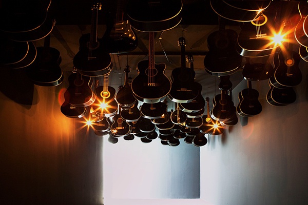 OM : L’installation fonctionne comme un orage, avec ciel et nuages noirs. Les guitares, les basses, les ukulélés, les banjos symbolisent la menace d’un orage sans précédent que seul Brian Wilson aurait vu venir sur l’horizon brillant des Beach Boys. L’âge d’or de la musique surf est court, comme lorsqu’une session de surf prends soudainement fin parce que le temps change.