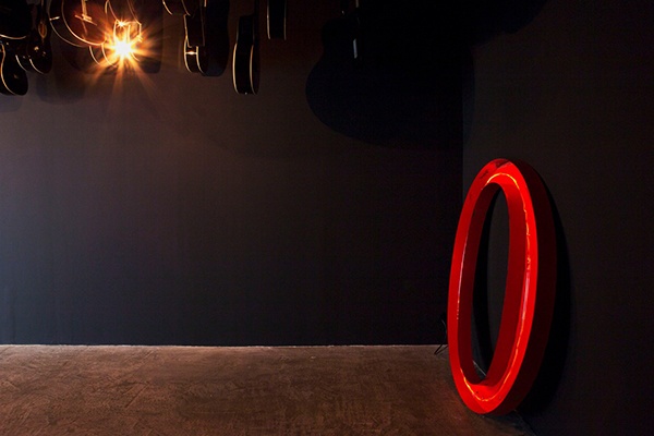 Le O est une vielle lettre de néon récupérée, souvenir d’un passé brillant posé à même le sol. Elle pourrait être une lettre de n’importe qu’elle enseigne, celle des Beach Boys, du film Out Of Sight, où bien n’importe qu’elle autre marque. J’ai enlevé le tube néon et l’ai remplacé par une résistance de chauffage. Là où normalement un néon fonctionne avec de la lumière, visuellement, ici il marche plutôt de façon sensitive, plus on s’approche du O, plus on ressent sa chaleur.