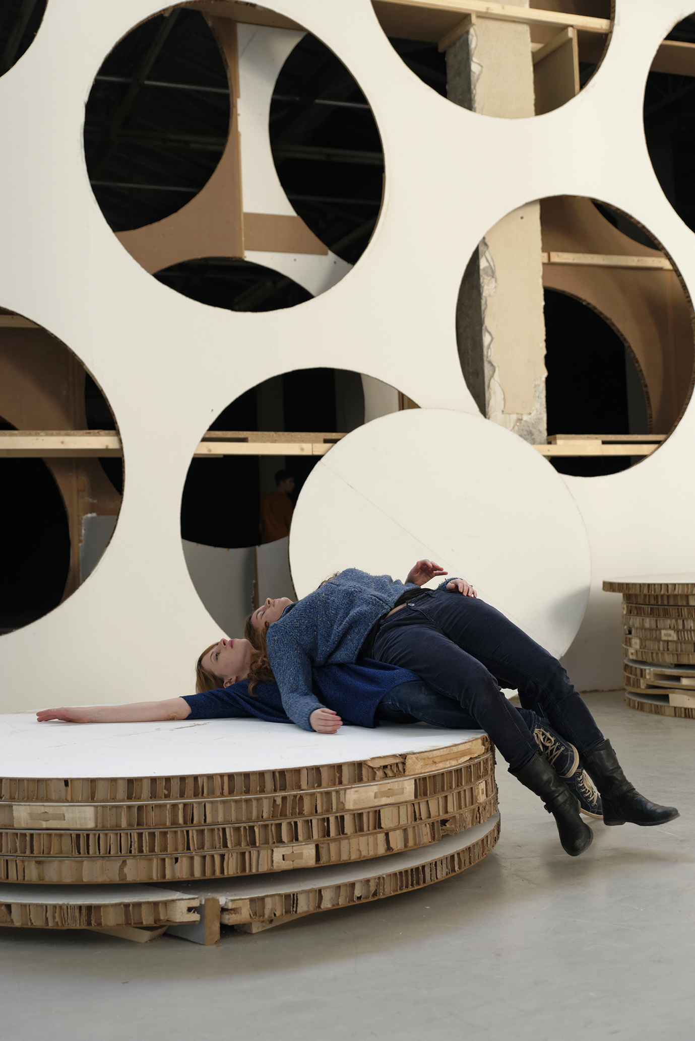 L’escalier monumental qui nous conduit dans l’antre du Palais de Tokyo dévoile déjà le paysage mouvant, en perpétuelle transformation de l’orbe de New York : des visiteurs sillonnent l’espace sur les vélos mis à leur disposition par l’artiste Ann Veronica Janssens, s’immobilisent comme en apesanteur hissés sur la sculpture participative de Didier Faustino, Opus incertum (2008), qui rejoue la célèbre photographie Le Saut dans le vide (1960) d’Yves Klein, investissent la Structure multifonctions modulable de Nicolas Floc’h, discutent à bâtons rompus d’art contemporain avec Mauricio Ianês, performer brésilien qui les accueille tous les jours, de midi à minuit. Placée en haut de marches, l’œuvre historique de Ian Wilson, Chalk circle on the floor(1968), risque de passer ainsi inaperçue, cercle discret tracé à la craie à même le sol, foulé aux pieds par les visiteurs et voué ainsi à l’effacement. Agnès Violeau et Sébastien Faucon, les deux commissaires de l’exposition Des choses en moins, des choses en plus lui confèrent une position liminaire, en préambule d’un parcours poétique et inspiré, imaginé à partir des collections immatérielles du Centre National des Arts Plastiques, qui met à l’honneur le vivant dans les espaces du musée. Œuvres performatives, fragmentaires, participatives, in progress, résolument ouvertes, appellent de leurs vœux les interactions avec visiteurs. C’est le geste, davantage que le regard, qui se déploie dans un espace-temps foisonnant, lequel se ressource dans la pensée pure, aussi bien que dans l’humour, dans la conscience politique et les émotions.