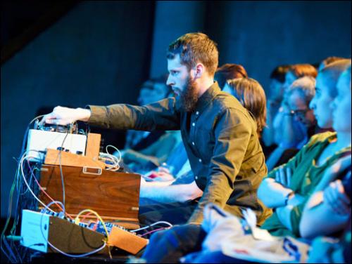 Instrument bâtard — l’harmonium indien était apprécié dans le temps pour sa robustesse et sa relative facilité à être embarqué dans des voyages — la machine à merveilles de Mind Over Mirrors permet aux circuits électroniques de se greffer sur un dispositif mécanique légèrement modifié : ce ne sont plus les mains, mais les pieds nus du musiciens qui pressent ses pédales pour faire entrer l’air dans les boyaux de la machine. Le corps, avec son engagement et son effort physique, fournit ainsi la matière première de cette musique à la fois éthérée et extrêmement intense. Les respirations profondes de la machine libèrent en flux continu des nappes sonores qui courent les unes sur les autres, se fondent dans un mouvement quasi-symphonique dont les vagues ressacs s’évanouissent, succombent à la richesse de demi-tons et aux infimes modulations qui ponctuent une vertigineuse montée en intensité. Le plateau devient sa caisse de résonance.