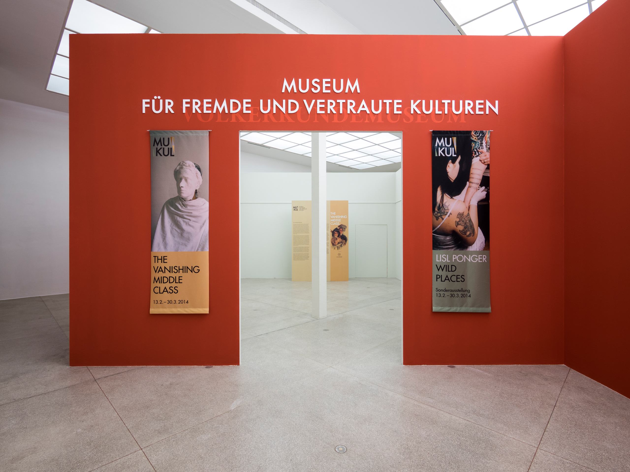 C’est à partir de ces problématiques qu’opère le « Museum für fremde und vertraute Kulturen » (MuKuL), traduit en anglais par « Museum for Familiar and Foreign Cultures ». Imaginé par l’artiste Lisl Ponger, le MuKuL est un musée d’ethnographie fictif dont l’acronyme fait ironiquement référence au changement de nom massif des musées d’ethnographies à travers le monde ces dernières années[3]. Intitulée «The Vanishing Middle Class », la première exposition du MuKuL propose une vision « ethnographique » de la classe moyenne à la Secession à Vienne. Les relations qu’entretient cette classe avec la démocratie et le capitalisme sont examinées au fil des salles : « The Rise of the Western Middle Class », « The Middle Class in Peril », « From Playing by the Rules to Gaming the System », « Exhibits for Posterity » et « The Emerging Middle classes ».