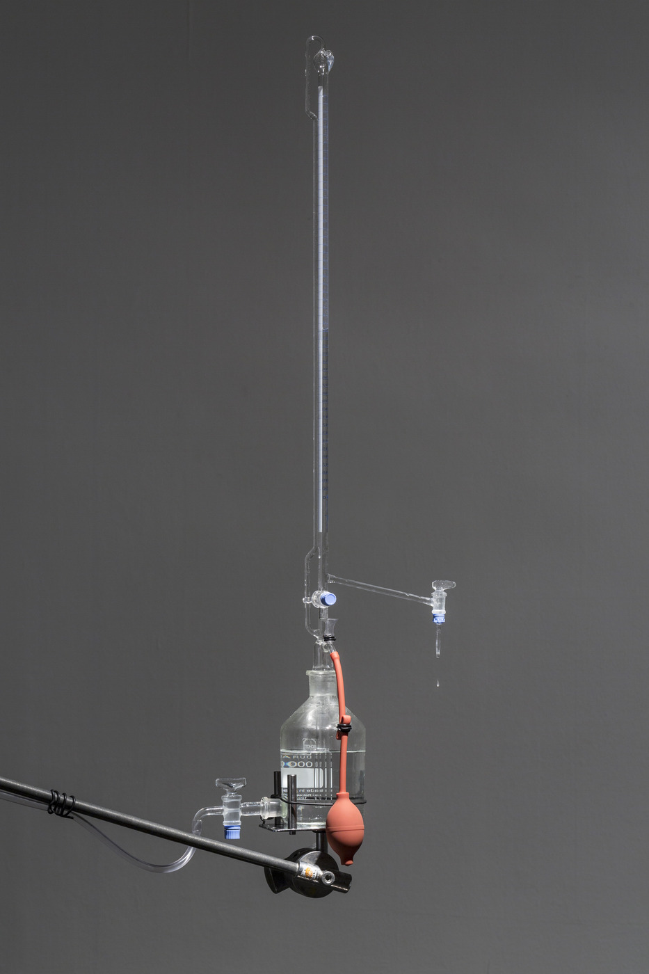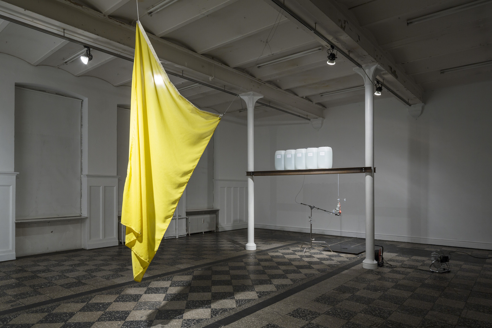 Dès la première salle, une installation composée de cinq barils remplis d’un liquide translucide reliés par un mécanisme de tubes, pipettes, ventilateur, poire et robinet annonce d’emblée l’esthétique choisie par l’artiste. Le fluide qui reproduit la composition chimique exacte de la sueur de l’artiste s’écoule goutte à goutte sur une plaque de métal au sol formant alors progressivement une sculpture-stalagmite blanchâtre (Self-portrait, Perspiration and Respiration, 2014).