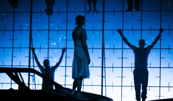 A cette image initiale du chaos succèdent une forte musique et une chorégraphie qui amène chaque personnage à crier son nom et à demander le droit de raconter son histoire, à exprimer le désir de se faire entendre. Dans ce cadre se rejouent alors les mythes les plus tragiques et les plus beaux. Ovide est lui aussi incarné, il annonce d’emblée son immortalité au travers de son œuvre – sa métamorphose à lui – et il joue les metteurs en scène. Il annonce d’abord l’histoire de Myrrha, puis celle d’Orphée et Eurydice, et encore celle d’Icare et Dédale, d’ici une heure. Une fois l’ordre réglé, un régime plus intime peut se mettre en place. Dans une voiture, un homme raconte l’amour désespéré de Myrrha pour son père. Une caméra saisit son visage, projeté sur le fond de la scène dans des couleurs chaudes. A ses côtés, apparaît celui de Myrrha, prêté par une jeune femme, et leurs traits numériques s’unissent et se confondent dans un baiser incestueux.