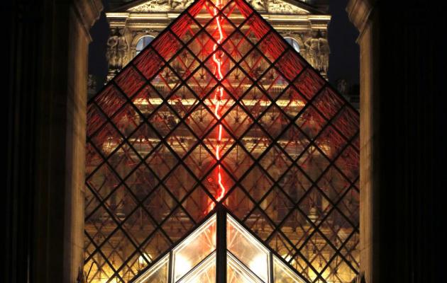 Avec une énergie dense, l’œuvre de Claude Lévêque dialogue avec les lieux qu’elle rencontre pour y activer une forte charge d’évocations et de sensations. Son intervention débute par une mise en incandescence de la pyramide de Ieoh Ming Pei. Liée à la symbolique antique, cette œuvre fait écho aux modules triangulaires des structures tendues et s’inscrit plus largement dans l’architecture alentour et dans la perspective du Carrousel du Louvre jusqu’à l’obélisque puis La Défense.
