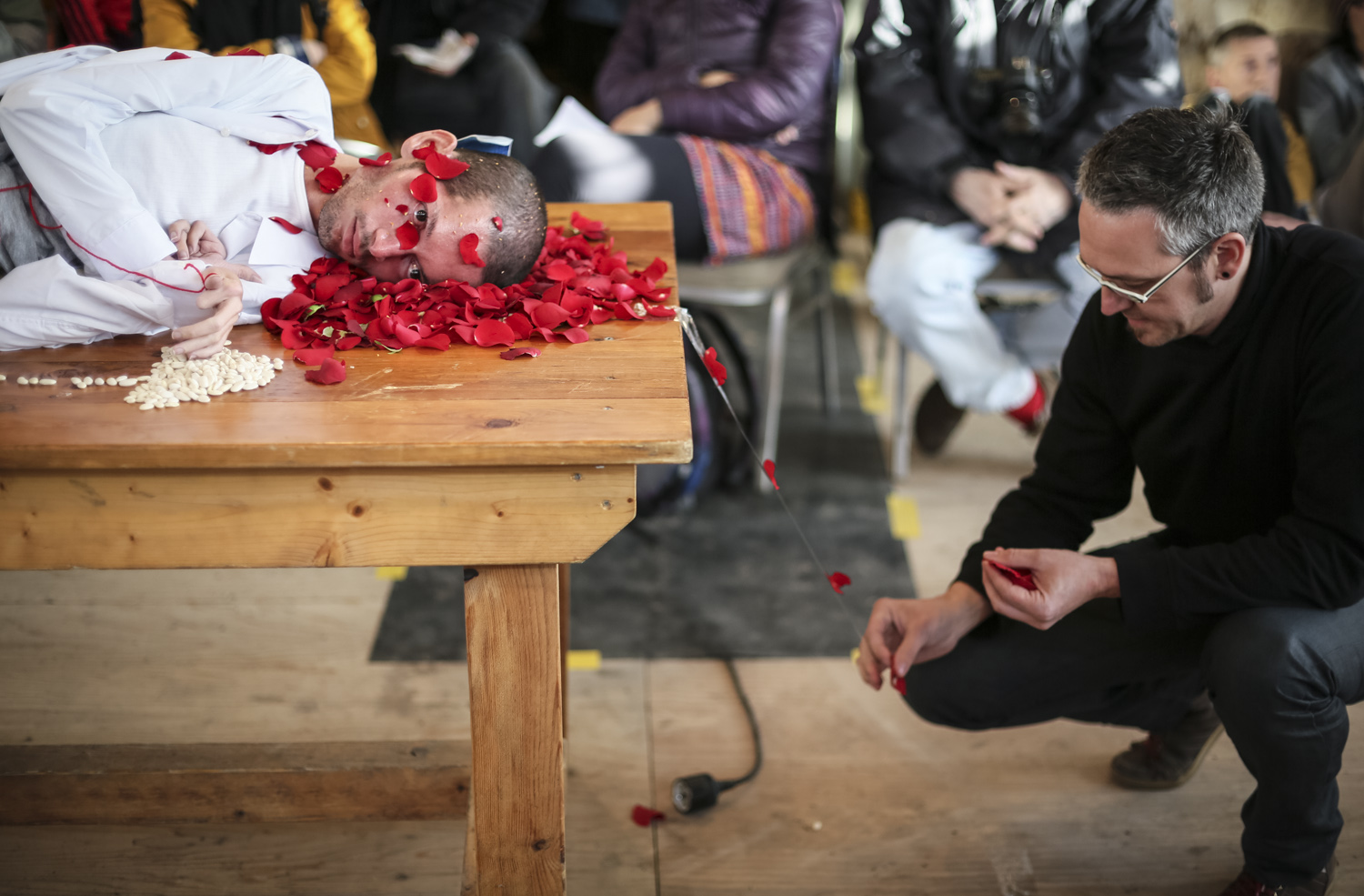 Également narrative mais cette fois absolument silencieuse, la performance touchante de l’artiste Kamil Guenatri, effectuée avec et par son auxiliaire de vie fut certainement l’un des moment les plus forts de la soirée. Sorti de l’emprise de son fauteuil mécanique qui lui soutient habituellement tout le corps, l’artiste est ensuite délivré de ces prothèses, sorte de chrysalide sans laquelle il devient alors un corps fragile soumis aux manipulations délicates de son assistant. La vulnérabilité physique de l’artiste se juxtapose à la légèreté délicate des pétales de roses qui le couvrent, la longue cérémonie qui tient presque du sacré, se termine en une composition esthétique et symbolique hautement poétique.