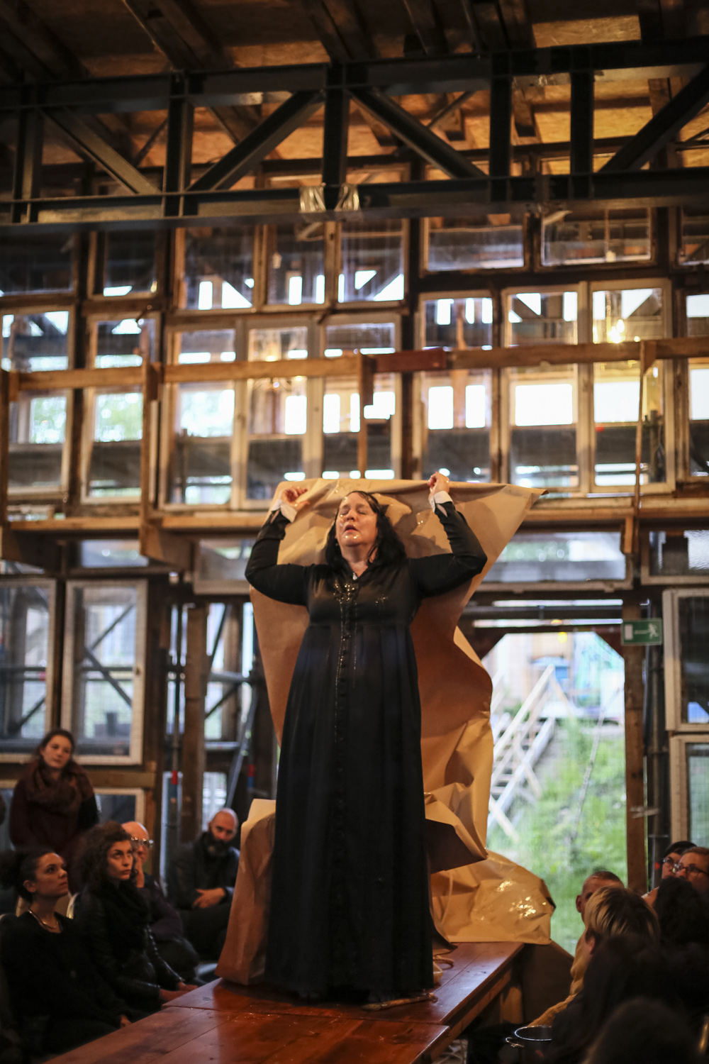 Alliant cette fois le texte à l’action corporelle symbolique, Irène Loughlin incarne intensément et avec souffrance ses troubles intimes lors d’une procession étrange sur la table d’où elle en sort, après d’angoissants gémissements et sanglots, étonnamment sereine.